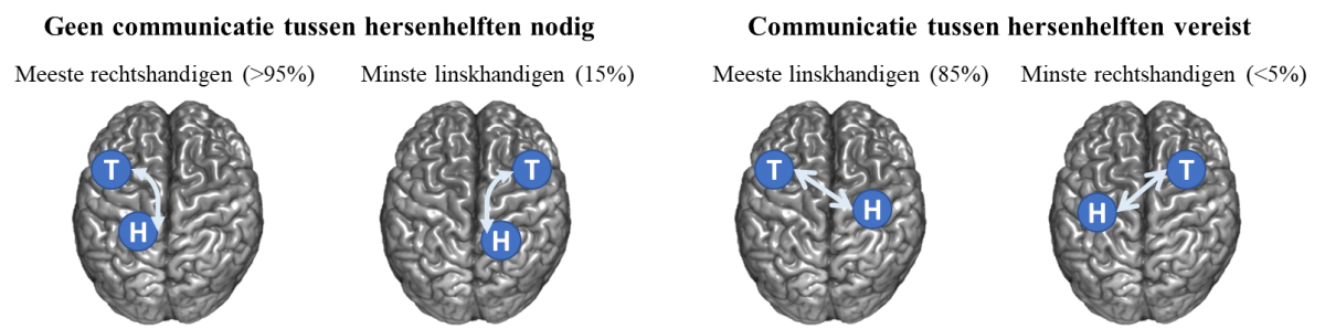 Figuur 2 – Vier mogelijke combinaties van handvoorkeur (H) en taaldominantie (T). Bij de meeste rechtshandigen is de linkerhersenhelft dominant voor motorische uitvoering en taal, waardoor communicatie – weergegeven met het pijltje – tussen de twee functies binnen dezelfde hersenhelft gebeurt. Bij de doorsnee linkshandige zijn beide functies dominant in tegenovergestelde hersenhelften. Hierdoor verloopt de informatieoverdracht tussen de hersenhelften.