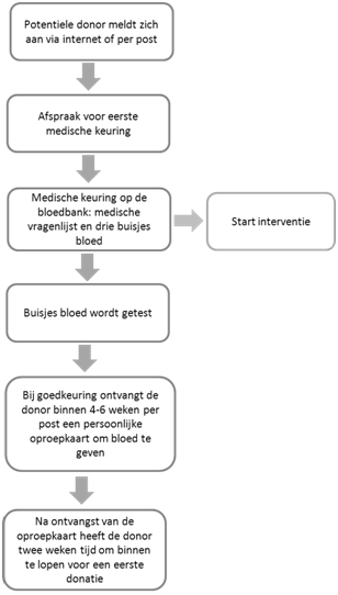 In een interventiestudie wilden we kijken of het inzetten van deze technieken leidt tot een verhoogde opkomst (Wevers, Wigboldus, Van den Hurk, Van Baaren & Veldhuizen, 2015). Daarom kregen 937 nieuwe donoren, die zich hadden aangemeld bij de bloedbank (Sanquin) na hun eerste medische keuring een extra informatieformulier. Op dit informatieformulier werd het oproepensysteem uitgelegd en eventueel aangevuld met de technieken ‘implementatie intenties’ en ‘commitment’ (zie figuur 1 ‘ start interventiestudie’). Het is binnen het oproepensysteem van Sanquin niet mogelijk om een donatieafspraak in te plannen op datum en tijd. Daarom werd aan een deel van de nieuwe donoren gevraagd of ze voor zichzelf een dag en tijdstip wilden inplannen waarop ze bloed zouden gaan doneren (implementatie-intentie). Aan een ander deel werd gevraagd of ze het informatieformulier wilden ondertekenen (commitment). Donoren kregen willekeurig één van deze technieken of een combinatie ervan. Vervolgens kreeg ongeveer de helft van de donoren een aanvullende vragenlijst over hun motivatie, waaronder vragen over intentie (“Ik  blijf bloed donor totdat ik niet meer mag doneren”) en self-efficacy (“Als ik zou willen lukt het mij om bloed te blijven geven zolang mijn gezondheid dat toestaat”). Uiteindelijk werd gekeken of het uitvoeren van één van deze technieken, of een combinatie van beide, leidde tot een verhoogde opkomst na een oproep voor een eerste donatie.