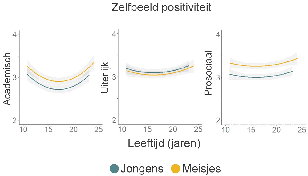 Figuur 3. Jongeren zijn in het midden van de adolescentie tijdelijk wat minder positief over zichzelf, vooral als het gaat om hun zelfbeeld in het academische domein, waarin jongeren zichzelf beoordelen op eigenschappen zoals ‘Ik ben slim’, ‘Ik ben gemotiveerd op school’, en ‘Ik werk chaotisch’. Later herstelt zich dat weer.