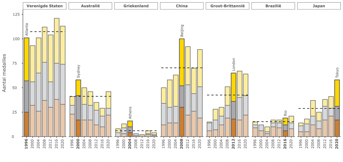 Figuur 1. Overzicht van alle medailles gewonnen door de laatste 7 landen die gastheer waren van de Olympische Zomerspelen. (bron: eigen werk)