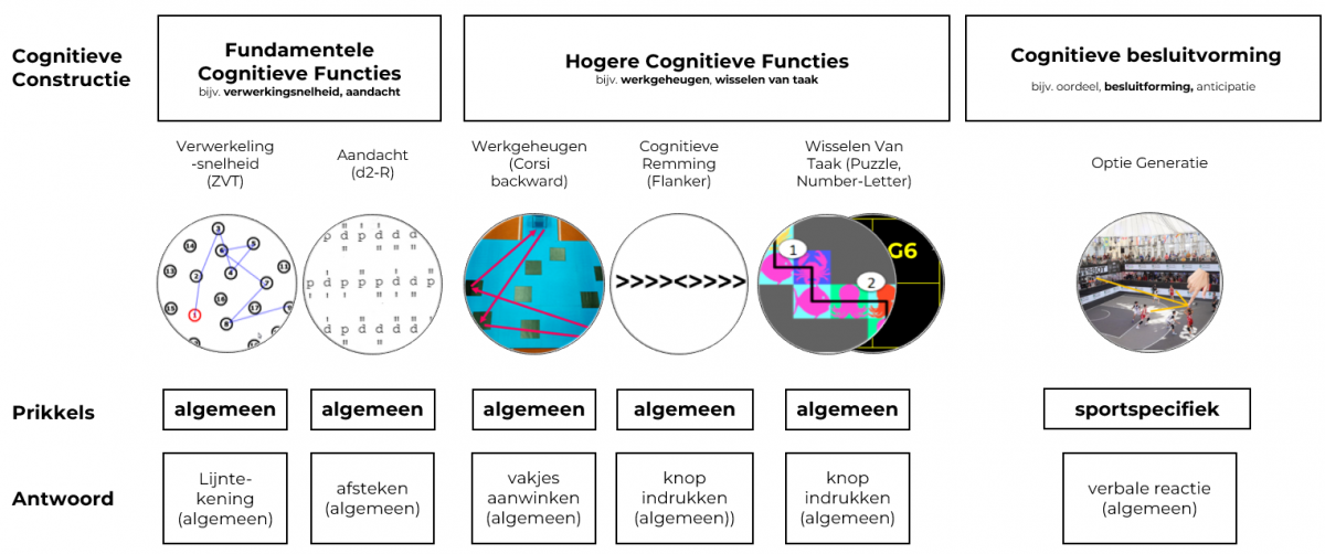 Vooral bij interceptieve sporten (sporten waarbij een object zoals een bal onderschept of gereturneerd moet worden, zoals tennis) en teamsporten blijkt cognitie een centrale rol te spelen bij het ontwikkelen van excellente sportprestaties (Kalén et al., 2021). Hieronder nemen we basketbal als voorbeeld om beter te begrijpen hoe cognitie samengaat met atletische expertise. Basketballers moeten voortdurend split-second beslissingen nemen en tegelijkertijd complexe fysieke bewegingen uitvoeren. Tijdens een wedstrijd maken belangrijke basale cognitieve functies het mogelijk om op te letten waar medespelers zich bevinden of om constant binnenkomende informatie te verwerken, zoals aanwijzingen van de coach. Hogere cognitieve functies omvatten verder het bijwerken en ophalen van informatie uit het werkgeheugen, het afremmen van reacties en het wisselen van taak als de omstandigheden veranderen. Daarnaast hebben spelers specifieke cognitieve vaardigheden nodig, zoals het anticiperen op het gedrag van tegenstanders of het genereren van opties voor hun eigen mogelijke volgende acties en het nemen van beslissingen onder druk (zie Figuur 2 verderop). Hieronder nemen wij jullie mee in een verkenning van de rol van cognitie en cognitieve diagnostiek tijdens een speciale trainingsdag van de Olympische nationale ploegspeelster Sofia, die deel uitmaakt van het interdisciplinaire onderzoeksproject "in:prove". Dit project is gericht op het verbeteren van atletische prestaties door middel van geïndividualiseerde diagnostiek en interventies.